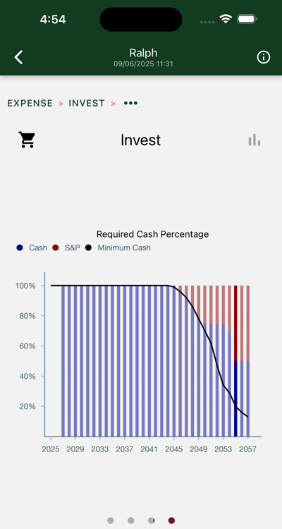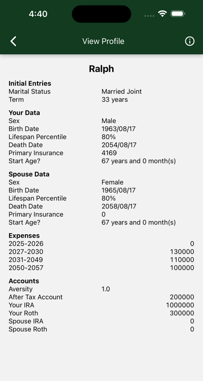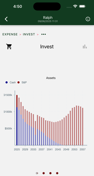 Your assets were mostly in cash (inflation protected bonds) at the start of retirement. A smaller portion was set aside in S&P investments, reserved for the later years. Compounding kicked in and you would have gone on forever, but regrettably, Ralph died and Mom's spousal benefit stopped.