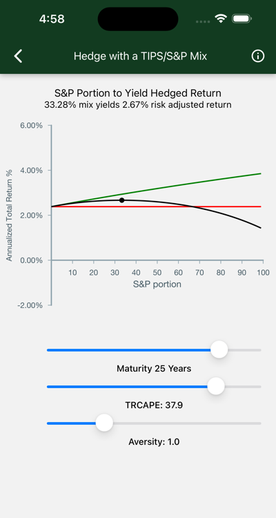 Each year is hedged separately. Anchoring the hedge, we have the TIPS real yield. A portion of S&P is added to bring up the yield to a point commensurate with your risk tolerance. These portions (shown by the black line) are determined by an open algorithm, soundly based in History and Economics.