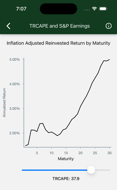The chart is initially displayed for today’s TRCAPE. Look on the y-axis to find your expected annualized return for 30 maturities.