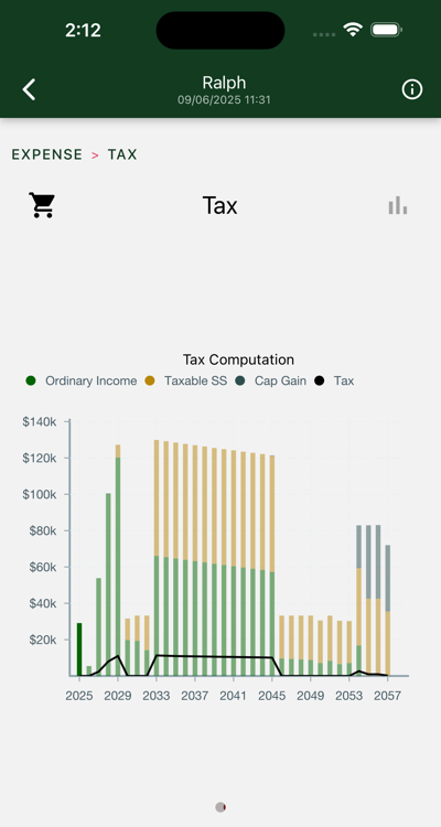 When you set up your Hedgematic profile, you specify spending requirements for each individual year in after-tax, inflation-adjusted dollars. Hedgematic computes your estimated taxes for each year and includes them in each year's draw. Illustrated here are the tax inputs and total federal income tax for each of these years. Notice the following: