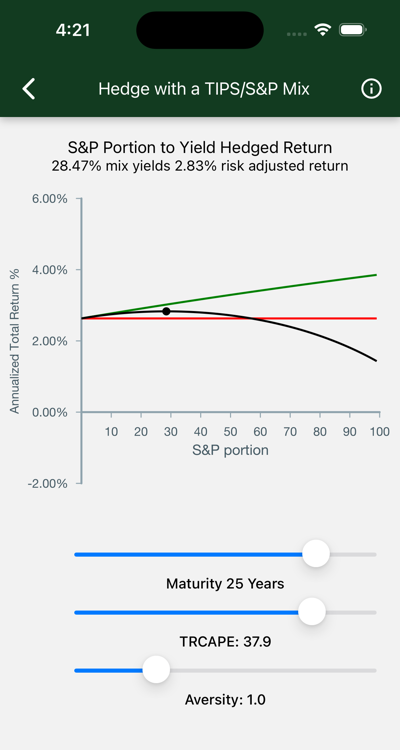 The chart shows expected annualized total after-inflation return of a fixed-term S&P/TIPS mix, with S&P content ranging from 0 to 100%. Use the sliders to see the effect of changes in starting assumptions: term, aversity, and TR CAPE.